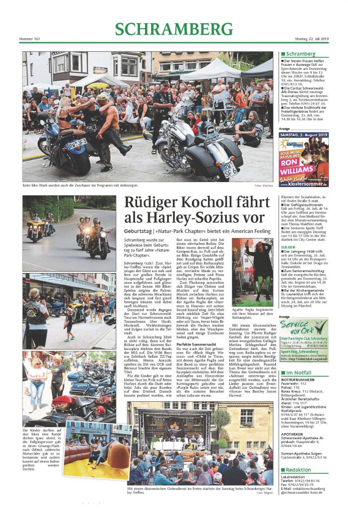 Wir hatten ein tolles Wochenende! Nicht nur unsere Gäste, sondern auch wenige Schramberger konnten bei super Wetter schöne und besondere Bikes bewundern. Menschen die noch nie in Schramberg waren freuten sich über tolle Lokalitäten und ein klasse Programm. Das war der Lokalzeitung sogar eine ganze Seite wert! Vielen Dank an alle die das Event möglich gemacht haben. Wir danken allen die da waren!